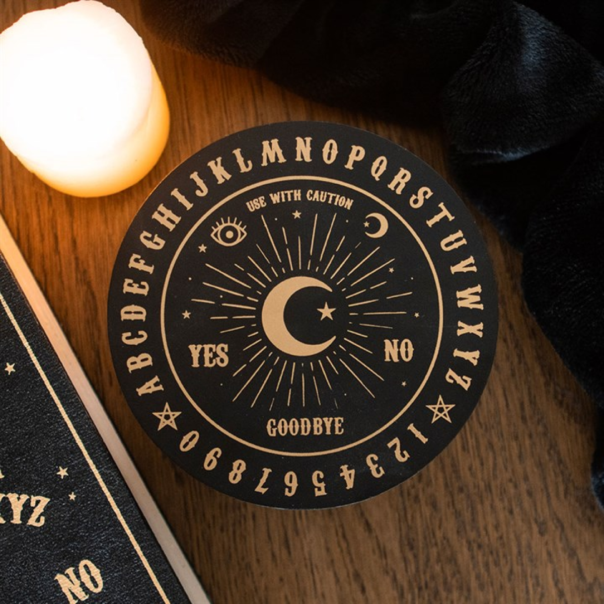 Store precious necklaces, rings and bracelets in this black jewellery box, decorated with a mystical talking board design in a gold finish. The jewellery box features a handy mirror in the lid - perfect for checking if accessories match the look! As well as offering safe keeping for your treasures, this jewellery box is perfect for displaying on dressing tables or bedside tables as a finishing touch to bedroom decor.